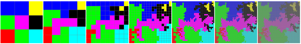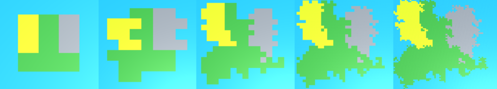 This algorithm could work for our project, though you might run into issues when there are more than 9 biomes due to the 3×3 start size. This algorithm sounds very interesting and is something unorthodox, so I decided to choose the Grown Biomes algorithm for my world generation.