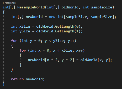 Now we loop through the old world array and set all the tiles present in the old world array into the new world array. But very importantly, not in the same spot but in the spot times two. So the first tile will end up at the second spot and the second tile will end up at the fourth spot etc. We do it like this for one so that the algorithm works and two this way the biomes can grow instead of us generating new biomes at the far end of the world with each iteration.