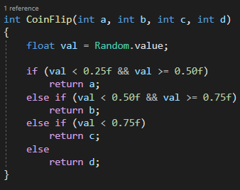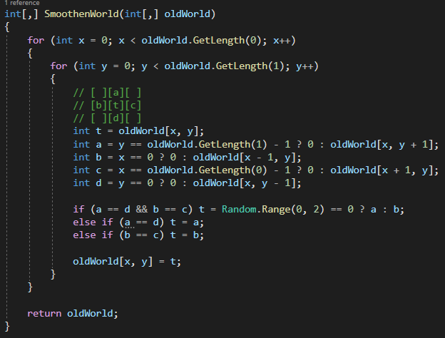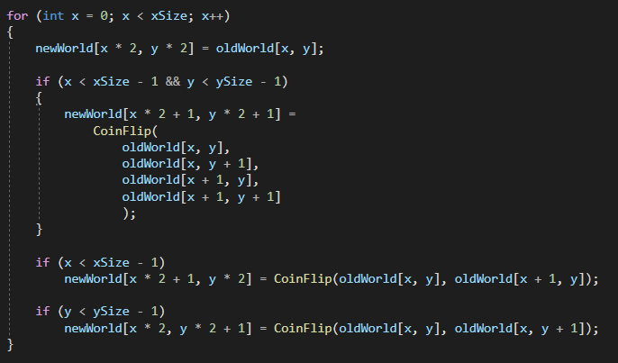Mathematically I don’t fully understand this but what this does is it checks if the current tile is an “empty” tile that needs to be filled. If it is, the coinflip function returns one randomly chosen argument back. So in the first case, we give the function four tiles from which we get one back and set the new world tile on (x,y) location to this tile.