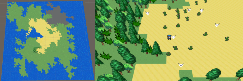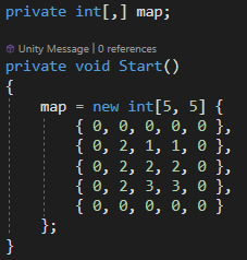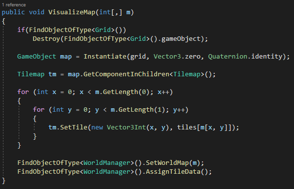 Switching to Tiles is much easier than I expected at first. At first, we create a new instance of the tilemap and, if one is found, we destroy the previous one. After this, we simply loop through the generated map(two-dimensional int array) and set the tiles in the tilemap equal to the generated map.