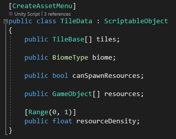 As you can see, above the class I added a line “[CreateAssetMenu]”. This line makes it so that you can right-click to create a new instance of this class in Unity. After creating four of these classes, one for each biome, and filling them in with the correct information we can start assigning the TIleData to the TIles. Assigning the TileData to the tiles is as simple as looping through all TileData instances and adding them to the dictionary DataFromTiles with the corresponding tile as key.