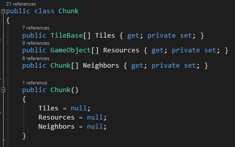 I had to do some thinking first, what do I want a chunk to keep track of? Obviously, it got to know which tiles are in the chunk. It would be beneficial too if the chunk knows which resources are in it and probably would be useful if it knows which chunks are its neighbors. Let’s make a new class with these three variables.
