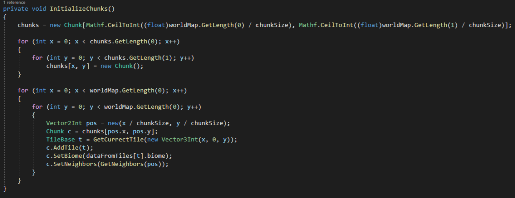Now we need to create the chunk instances. Each chunk has a size of 16×16 tiles. Of course, it is possible that the world gets generated in a size not divisible through 16, therefor when creating a new array we round up to the nearest number divisible through 16. Then we fill the array with chunks. After this, we loop through all tiles and add them to the correct chunk.