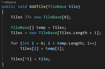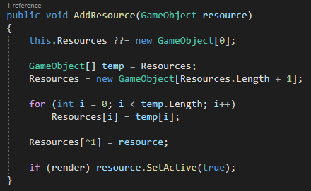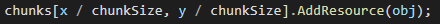 Remember back when we create resource spawns it had a line at the end which I said is for chunking. This line adds the resource to the chunk. The function it calls does the same as the AddTile function, it adds an object(in this case a resource) to the end of the array. But because you can’t just add an object at the end of an array we need to duplicate and create a new array which is one object bigger than the previous array.