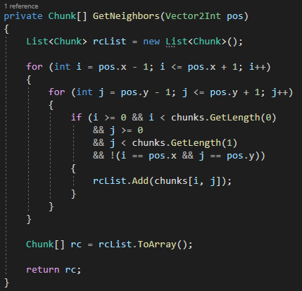 Getting the neighbors is as easy as can be. I create a List of chunks and loop through each chunk and check if there is a neighbor, to begin with. If so then add it to the list. At the end, we convert the list to an array and return that array.