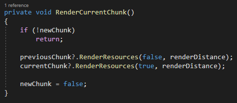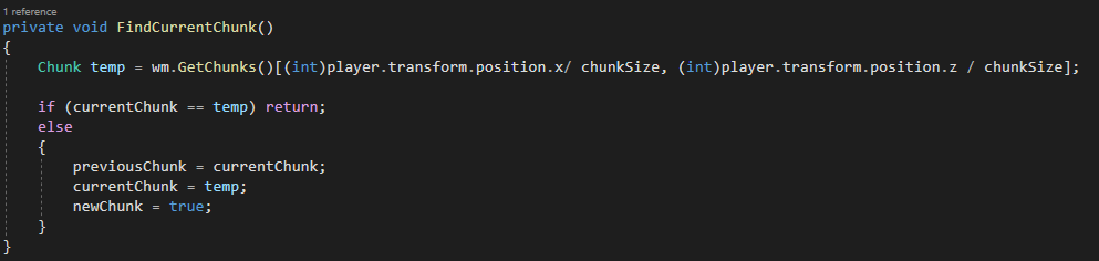 Now that each chunk knows who their neighbor is adding render distance will be a cakewalk. First, we gotta figure out which chunk the player is in. The GetChunks function returns the two-dimensional array in which the chunks are saved. With a simple check if the current chunk is not the same as the new current chunk we set the previous chunk to the current chunk and the current chunk to the new current chunk.