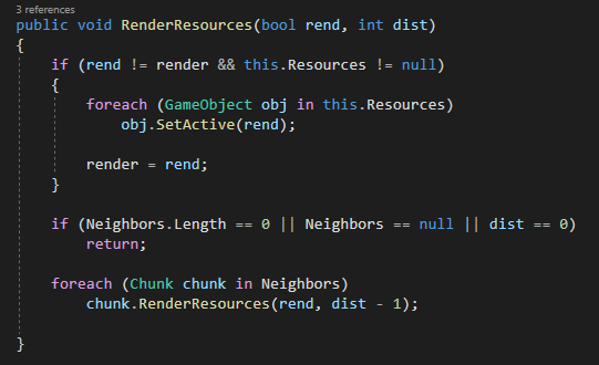 Render distance is done through nested functions. I keep recalling the RenderResources function as long as there are neighbors and the render distance is not zero. Each time I call this function I give the render distance minus one.