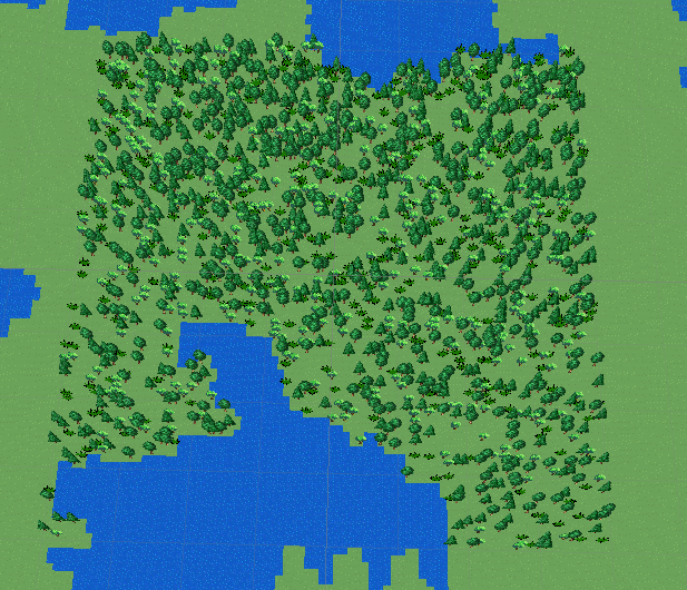 Okay yes, this works, we do have a bigger world but it’s still quite wet. This is because every value in the array that we don’t populate manually gets a default value, which is in the case of an integer zero. If you remember we bound the integer zero to a water tile so that explains the water everywhere. Now we can get into the mathematical part, filling in the gaps.