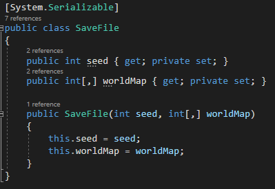 First of all, we need to create a class that keeps track of everything that has to be saved. As I said before, we want to save the seed and the generated world. The seed is a simple integer and the generated world is a two-dimensional integer array. In the constructor, we set the seed and worldMap to the values we got when making a new SaveFile instance.