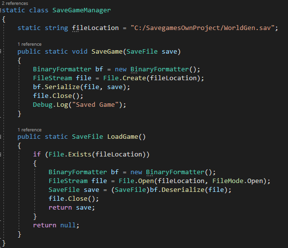 Saving and loading a file is pretty straightforward and doesn’t require a lot of explanation. We have to set a location on our PC to save the file to(note that if any of the folders is not present the save/load will crash). To avoid accidental changes to the saved file which would make it corrupt we encrypt and decrypt the file on save and load respectively. When we load the save file we need to make sure the game reads it as a SaveFile(our previously created class) to avoid corruption. This is why when we define the saved variable we tell it to deserialize as a SaveFile class by adding (SaveFile) in front of the deserialize function.