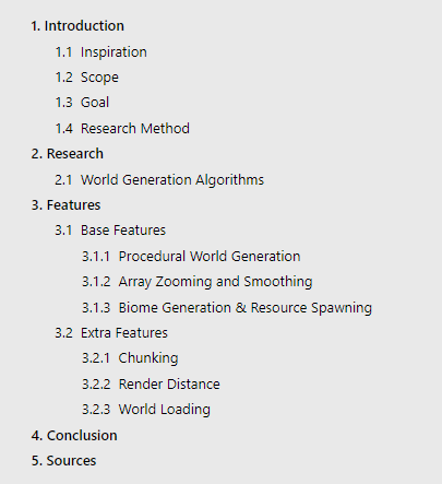 To define my goal as clearly as possible, if I manage to reach the fourth goal Extra: I want to create a prototype of a procedurally generated world in two-dimensional space that has multiple biomes. Each biome has its own pool of spawnable resources and a pool of spawnable monsters that roam around the world with pathfinding. The biomes have a smooth transition between each other to avoid sudden changes in scenery.