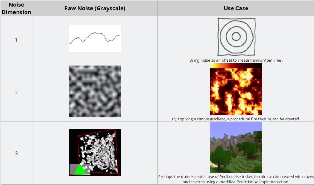 Perlin Noise is a useful tool to use while creating games or other visual products like movies. In game development, Perlin Noise can be used for all sorts of wave-like uses. For example, it works great for world generation, water, fire effects, and loads more(Understanding Perlin Noise, 2014). Perlin Noise comes in many different forms, from one-dimensional all the way up to four-dimensional, although the use of the fourth dimension does not pop up often. In our case, we would use two-dimensional Perlin Noise but three-dimensional is used often in world generation too like for example Minecraft-like generation.