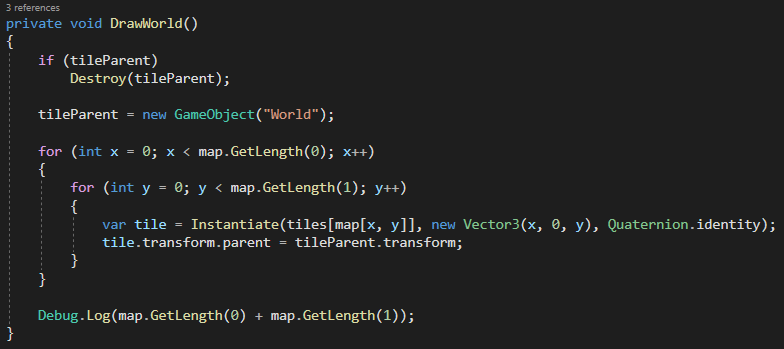 First I use a simple extra protection check for if there already is a tileParent (in case I want to regenerate a world in run-time). If that is the case, destroy this GameObject. After this check, we create a new tileParent GameObject.