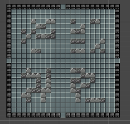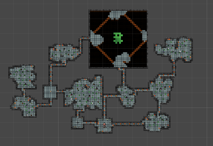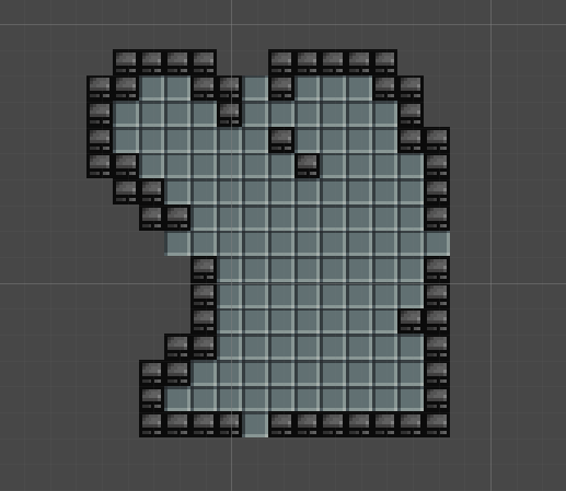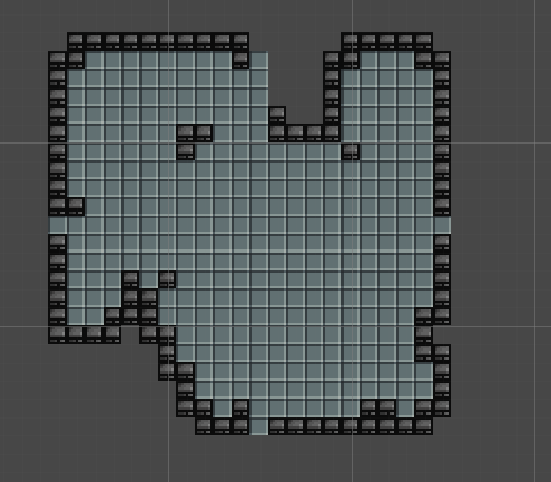 The room is now finishable. But I wasn’t happy with the result. You can clearly see that the rooms is split up in four parts, which makes it look less natural. Also the potential combat would be affected too much. With this layout the player will almost be forces to play in the center of the room, where there is barely any cover. The cover provided by the cellular automata leads to dead ends which is not optimal for the gameplay since the player could be cornered by enemies.