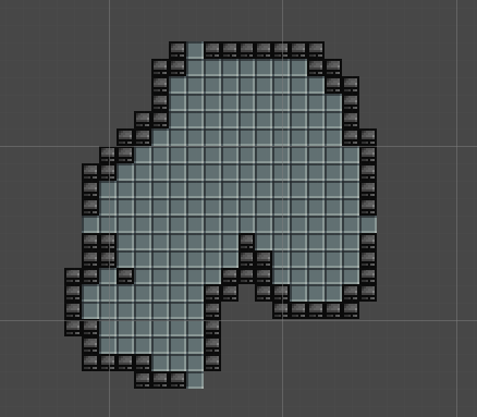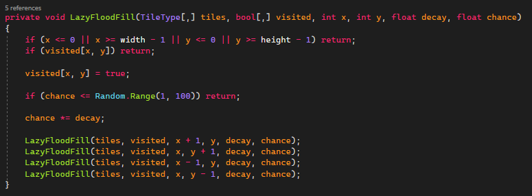 To improve the rooms design I did some more research and I stumbled on an algorithm called lazy flood fill. What this algorithm does is it starts on a specific tile. Then the algorithm recursively explores adjacent tiles to decide wether or not they should be filled in, using a chance value that gets smaller with each iteration. If the chance value is less than a random number between 1 and 100, the tile is not filled and that iteration of the algorithm stops. By using this random chance it can create natural looking patterns. This results in rooms layouts that feel more natural and less rigid. To implement this I watched a tutorial from Klayton Kowalski (2021) and modified some parts of the algorithm.