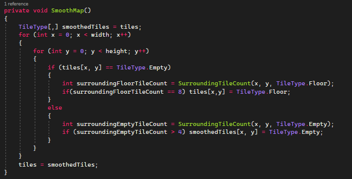 The cellular smoothing function iterates through each tile and checks how many neighbouring tiles it has. For floortiles it checks the surrounding tiles and counts how many of them are empty tiles. If there are more than four empty tiles surrounding a floor tile, it will become empty.