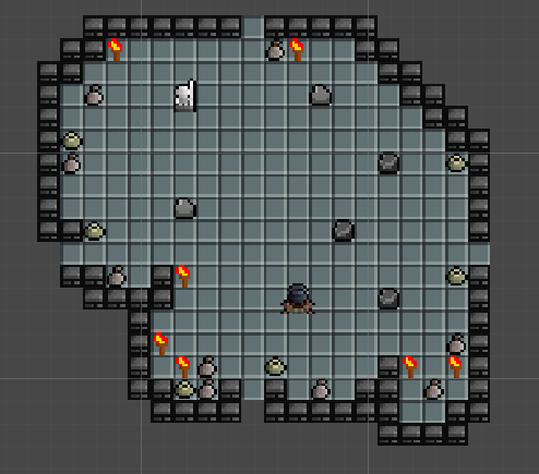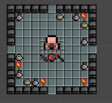 In Enter the Gungeon and Binding of Isaac they have a shop room where the player can buy new upgrades. This room has a NPC who sells the upgrades. To add a room with a similar feel to it to my project I designed a room that features an NPC selling items. The central feature of this room is an NPC sitting next to a variety of items available for purchase. The room is designed to provide players with an opportunity to upgrade their equipment and enhance their gameplay experience. By adding special floor tiles and an NPC in the center of the room, the shop room becomes more engaging and immersive for the player. I also added some decorations near walls like in the battle room.