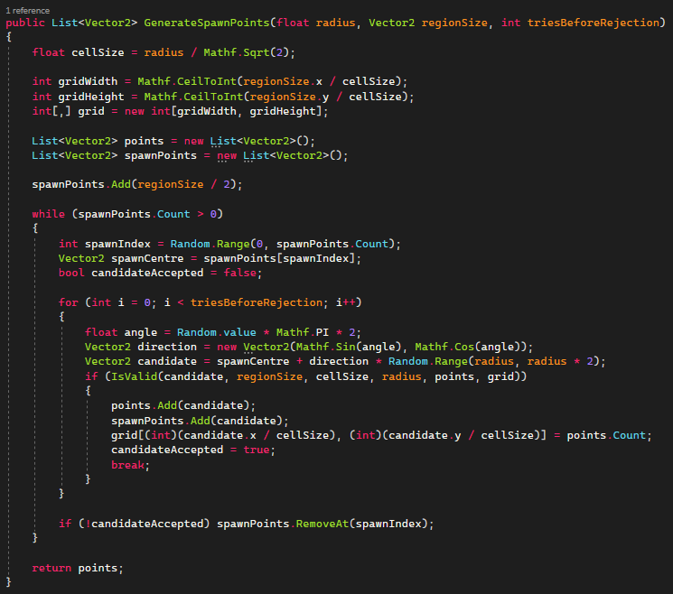 The GenerateSpawnPoints function first calculates the size of the cells in the grid based on the radius of the minimum distance between points. It then creates an empty grid and initializes a list of points and spawn points. The region’s center is first added to the list of spawn points in the function.