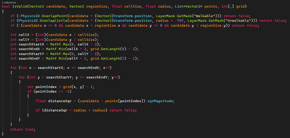 This is done by determining whether the candidate point is on a walkable tile, within the radius of an impassable item (which can block the player or spawn an enemy outside of the region), or inside the region size. If none of these apply, the function moves on to the next stage. Then, this program effectively searches for neighboring points using a grid approach. It determines which cell the candidate point is in and looks for any previously created points around that cell. Next, it determines the distance between each adjacent point and the candidate point. If any of those distances are less than the threshold, it returns false.