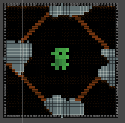 I wanted to have some obstacles within the room where the player could hypothetically hide from enemies or bullets. To implement this I initially had the idea to implement cellular automata with the rules of game of life in a square room. Cellular automata combined with these rules make for some interesting shapes and it also looks somewhat natural. I read a blog about cellular automata (Shiffman, z.d.) and modified the rules to Conway’s game of life (Lipa, z.d.). However I quickly realised that the rooms were not traversable. To address this issue I modified the room to create a cross shape in the center of the room. This way the player could finish the room.