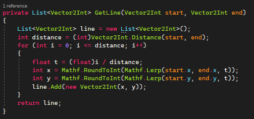 The function creates a loop from 0 to the distance inclusive. For each iteration, it calculates a normalized value ‘t’ as a ratio of the current iteration ‘i’ to distance. This value ‘t’ is used to interpolate between the start and end x and y coordinates, and the resulting values are rounded to the nearest integer. The resulting position with the rounded x and y coordinates is added to the line List. At the end it returns a list of positions that indicate the positions of the bridge tiles.