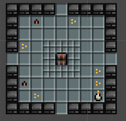 The chest room is basically the same as the shop room but with some minor changes. There isn’t an NPC and there aren’t items the player can buy. The room consists of a chest and some decorations. To have a different feel in the chest room I added coins and candles as decoration to make the room feel like a treasure trove.