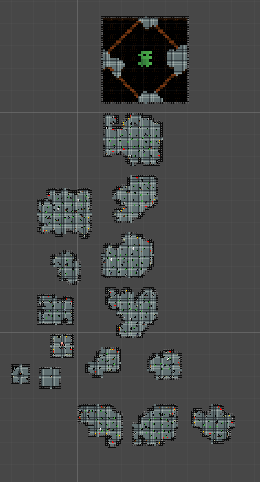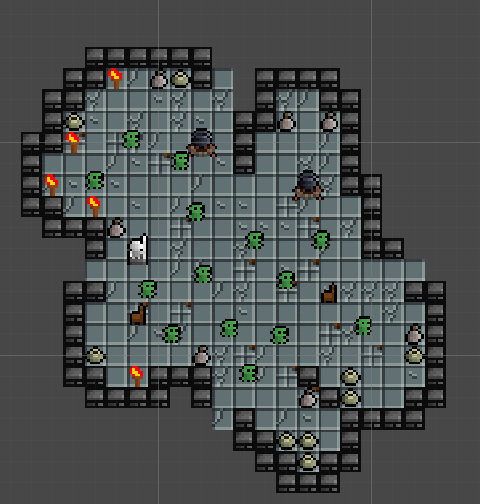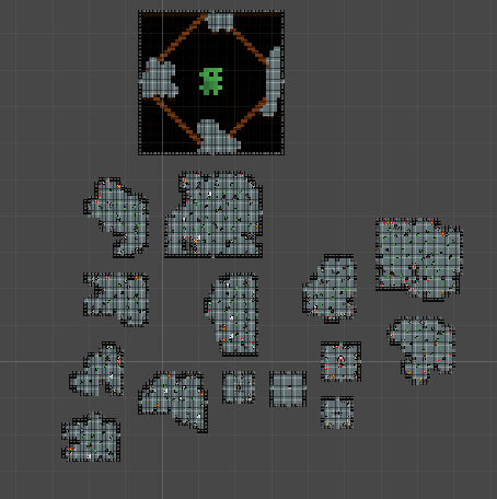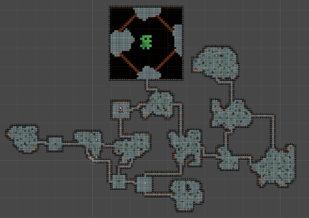 Based on the images, it’s clear that the lazy flood fill algorithm, combined with cellular automata, can result in some very interesting and visually appealing room layouts. The rooms look natural, with irregular shapes and organic patterns. Also this way of generating rooms will sometimes result in there already being some obstacles, which was not intended but it is an positive side effect that can add to the challenge and replayability of the game.