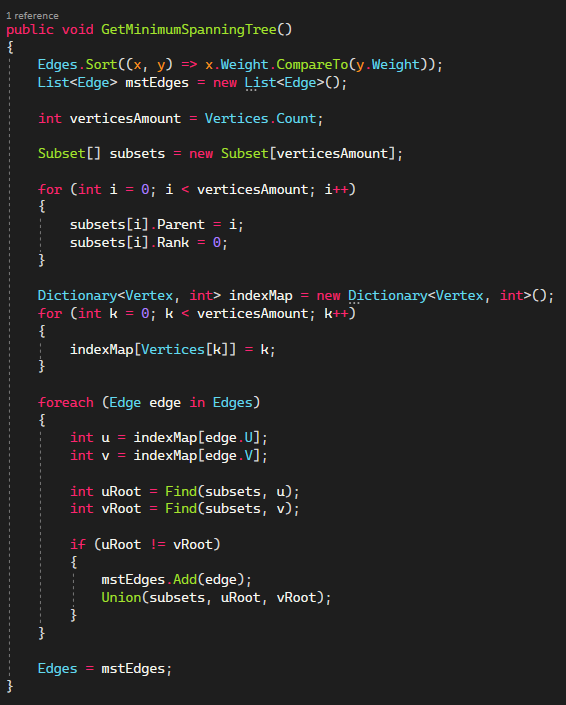 The function starts by sorting the edges by weight. Then it creates an array of subsets to keep track of the groups of vertices. Each subset has its own individual parent and starts at a rank of zero, this means the subsets has zero vertices in it. It then maps the vertices to the index in the Vertices list. Then it iterates through the sorted edges and checks if it would create a cycle. If it doesn’t create a cycle, the edge gets added in the minimum spanning tree.