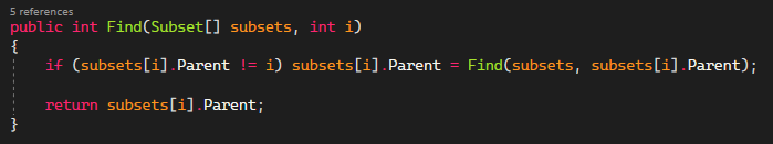 To check if the edges would form a cycle I made a Find function which uses recursion to find the root of the vertice. The function uses recursion to find the root node of the subset that contains a vertex at index ‘i’. It also uses a technique called path compression. What this does is it sets the parent of each visited vertex directly to the root node during the recursion, so that the next time Find gets called it will have a shorter path to the root.