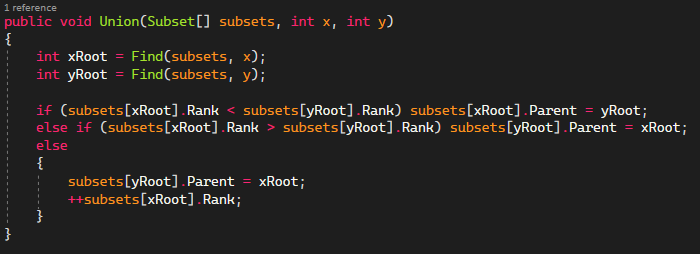 I created a Union function to combine the nodes. An array of subsets, together with an x and y value that indicate the vertex indices, are passed into this function. It recursively locates the vertices’ root nodes at the subsets’ x and y indices. If the two subsets have different root nodes, the function changes the parent of the smaller subset to be the root of the bigger subset. The parent of one of the subsets is updated, and its rank is increased, if both subsets have the same rank.