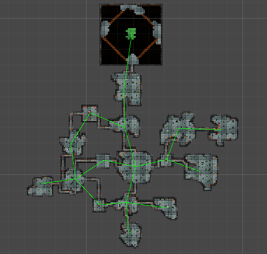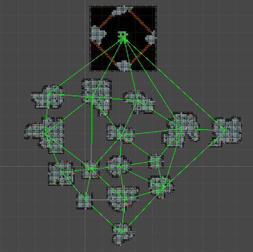 As you can see all the rooms are visitable, but this still isn’t what I want. In Enter the Gungeon and Binding of Isaac the rooms are interconnected. There isnt only one way to get to a specific room. To recreate this I added back some random edges from the Delaunay triangulation. To not have really long hallways I added a constraint on this, as such the long edges will not be added back to the minimum spanning tree. In Enter the Gungeon the hallways are never that long. This is because when the player has to walk in a boring corridor for a long time, it takes away from the immersion.