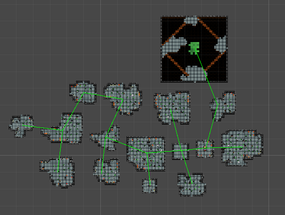 To fix the issue and create a more balanced dungeon layout, I decided to place the rooms in a horizontal strip instead of a square. This resulted in a more clustered and natural looking layout. Also, this change aligns with the tightly-clustered dungeon layouts in Enter the Gungeon.