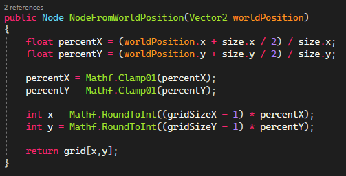 The second function I needed calculates the worldposition to a grid coordinate which is necessary for the pathfinding algorithm. I did this by converting the position into a percentage of how far along the grid it is. Then I clamped these values to always be between 0 and 1. This is because when an object is out of bounds, it will still return a percentage and not throw an error. I get the indices by multiplying the grid size by how far along the axis the worldposition is and round that to an int. I subtracted one from the grid size since arrays start at zero. At last I return the node on the grid that is on the worldposition given to the function.