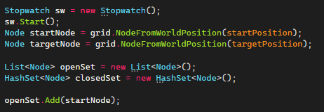 I first start a stopwatch to check how long each path takes to calculate. Then I use the NodeFromGridWorld function to get the nodes in the graph where the target and start node are. Then I define a list of nodes called openSet representing the nodes that are being considered for the path, and a hashset for the nodes that are already evaluated called closedSet. Then I add the starting node to the openSet list to start the pathfinding.