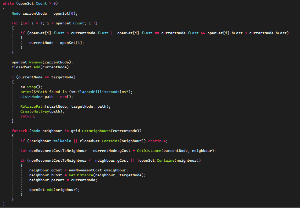 For the actual pathfinding itself the function start a loop that stops when there are no more nodes being evaluated or if the path has reached the goal node. In each iteration the algorithm takes the node from the openset with the lowest fCost. On the occasion that there are multiple nodes with the same fCost, it takes the node with the lowest hCost.