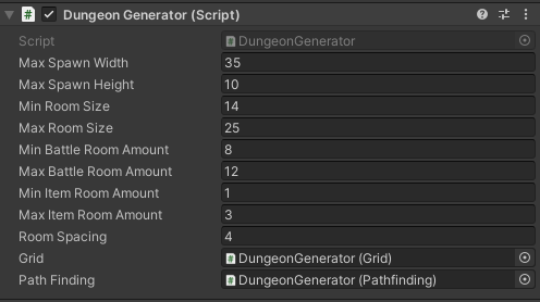 One of my criteria was that each dungeon should feel unique. To accomplish this I set a minimum and maximum value for the room size, amount of enemy rooms and the amount of chest rooms. I also randomized the amount of random edges being added back into the minimum spanning tree. This way each dungeon layout will be different from one another.