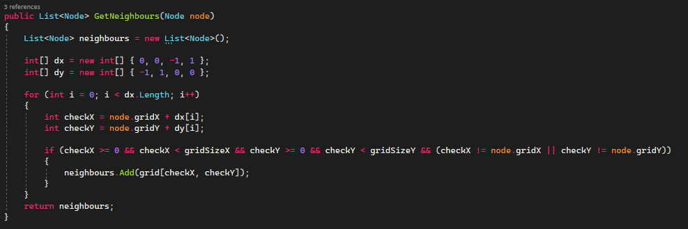 Otherwise it gets the neighbouring nodes of the current node. If the node is not walkable or if the neighbouring node is already evaluated, the for loop skips this neighbour. It then calculates the new fCost for the node. If the node is not in the open set, it gets added to it. If it is already in the open set the algorithm will determine wether the path to the neighbouring node from the current node is shorter. If that is the case, the costs and parent of the node will be updated and added to the openset.