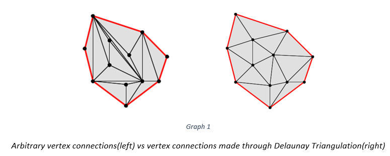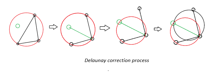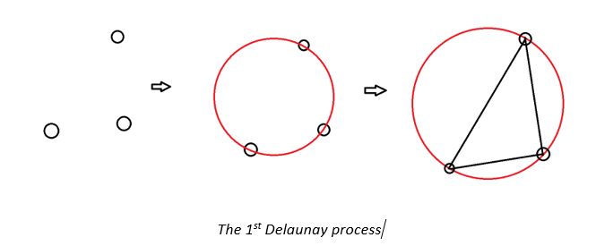 The Delaunay triangulation takes 3 vertices and draws a circle that overlaps the position of the 3 vertices. Once the circle is made, the algorithm will assign edges to the 3 vertices.