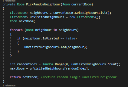 To setup the DFS, first I choose a starting room. From this room the DFS shall look into the neighbours of its current room and puts every neighbour labelled as “unvisited” into a list. Then it picks an unvisited neighbour from this list at random to be the next current room.