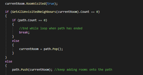Once the DFS has hit a dead end it will use the stack from earlier to retrace its steps back to a previous room. The reason this is done is because a good amount of those previous rooms still have neighbours that are unvisited, which means that there can be more pathways that can be created.