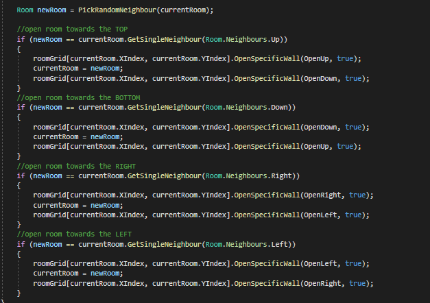 Before the DFS goes into the next room, it checks which direction it was headed towards. Once it knows the direction, it opens up the walls of the room in said direction and then changes the current room into the next room. From the next room it then also opens up the walls behind to complete the connection between both rooms.