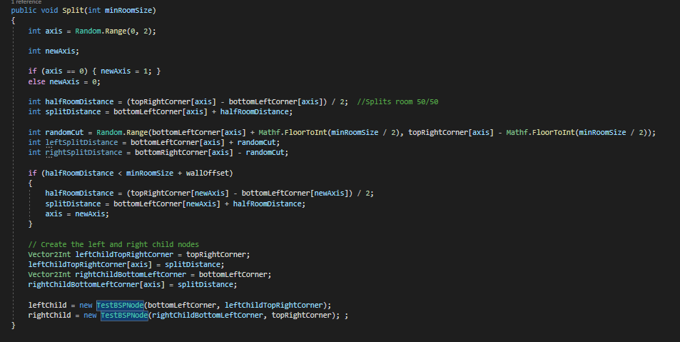 BSP is an algorithm that divides a huge room into subsections and in turn divides these subsections into smaller subsections. The subsections can be divided on the horizontal and the vertical axis at random. The dungeon that implements the BSP algorithm is being represented through a binary tree system. This algorithms makes it so that the rooms wouldn’t overlap and always be located within the constrains of the given max height and max width.