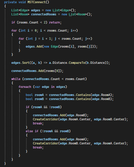 After all the rooms have been created, I used the same CreateCorridor logic from the BSP algorithm and applied it.