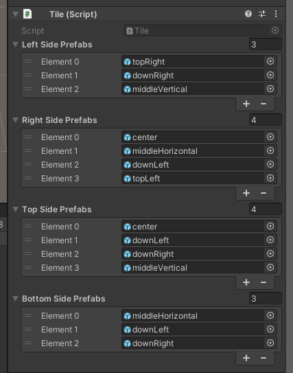 After the prefabs are made, I added a script that remembers what possible neighbours each side of a tile can have.